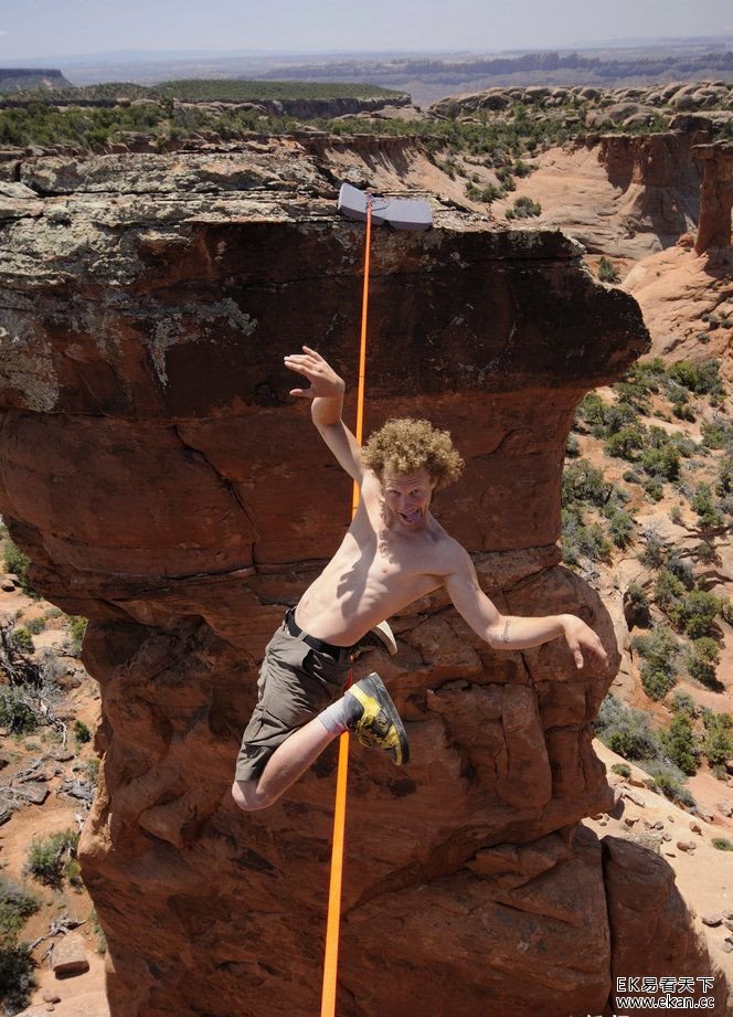在加利福尼亚州一处宽达15米的岩石峡谷上空,24岁的刘易斯在没有任何安全设施保护的情况下,平稳地走在高达30.48米的绳索上。但这似乎还是令他感到不够刺激,他有时甚至仅用脚踝挂在绳索上保持平衡。